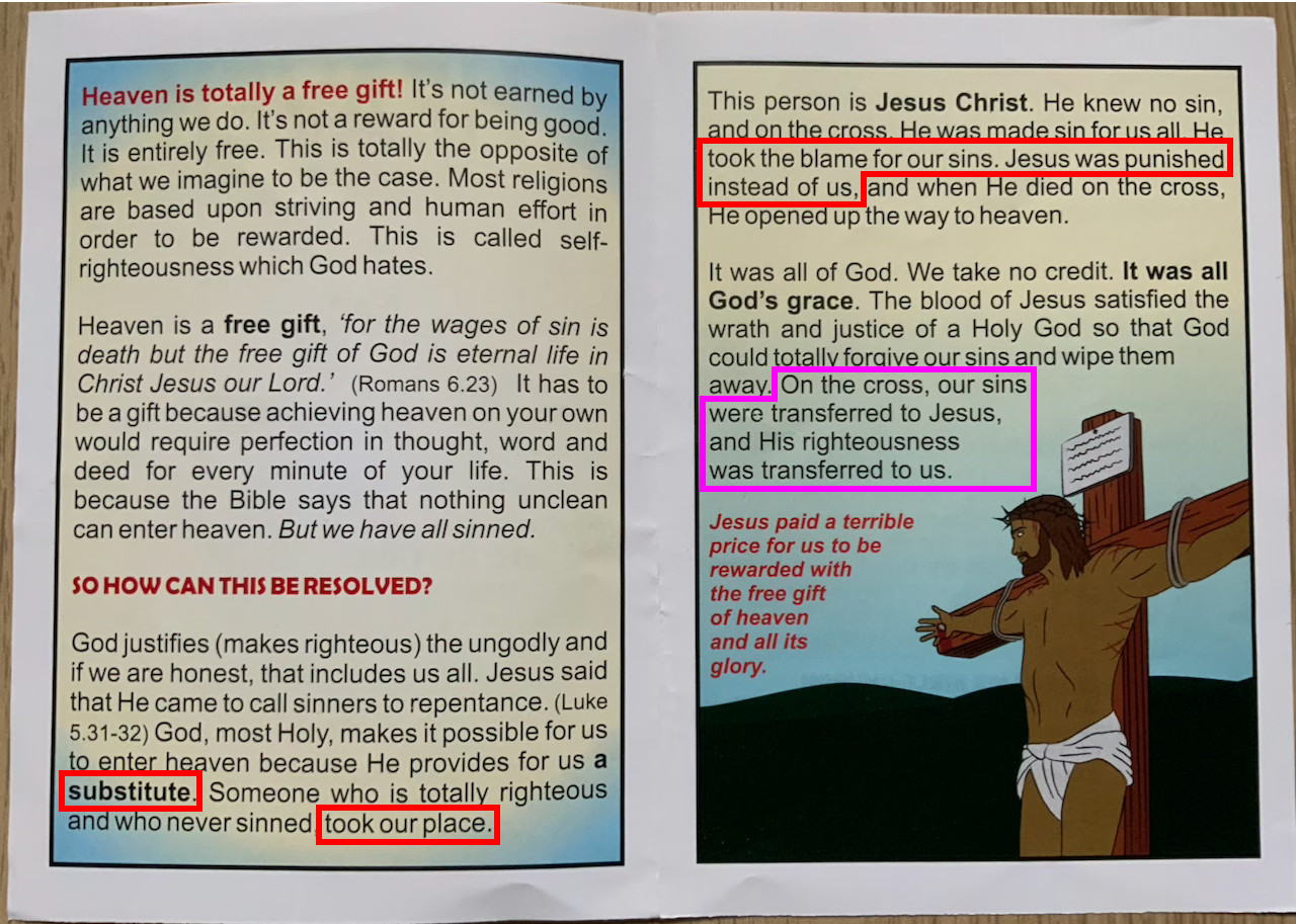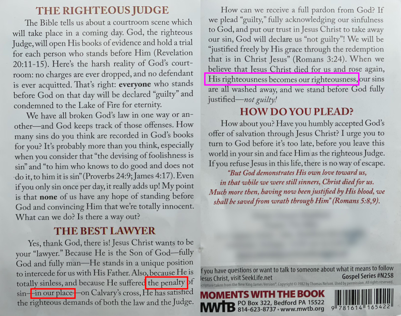 This tract presents the false doctrines of Penal Substitution Atonement (red highlights) and the Imputed Righteousness of Christ (purple highlight).